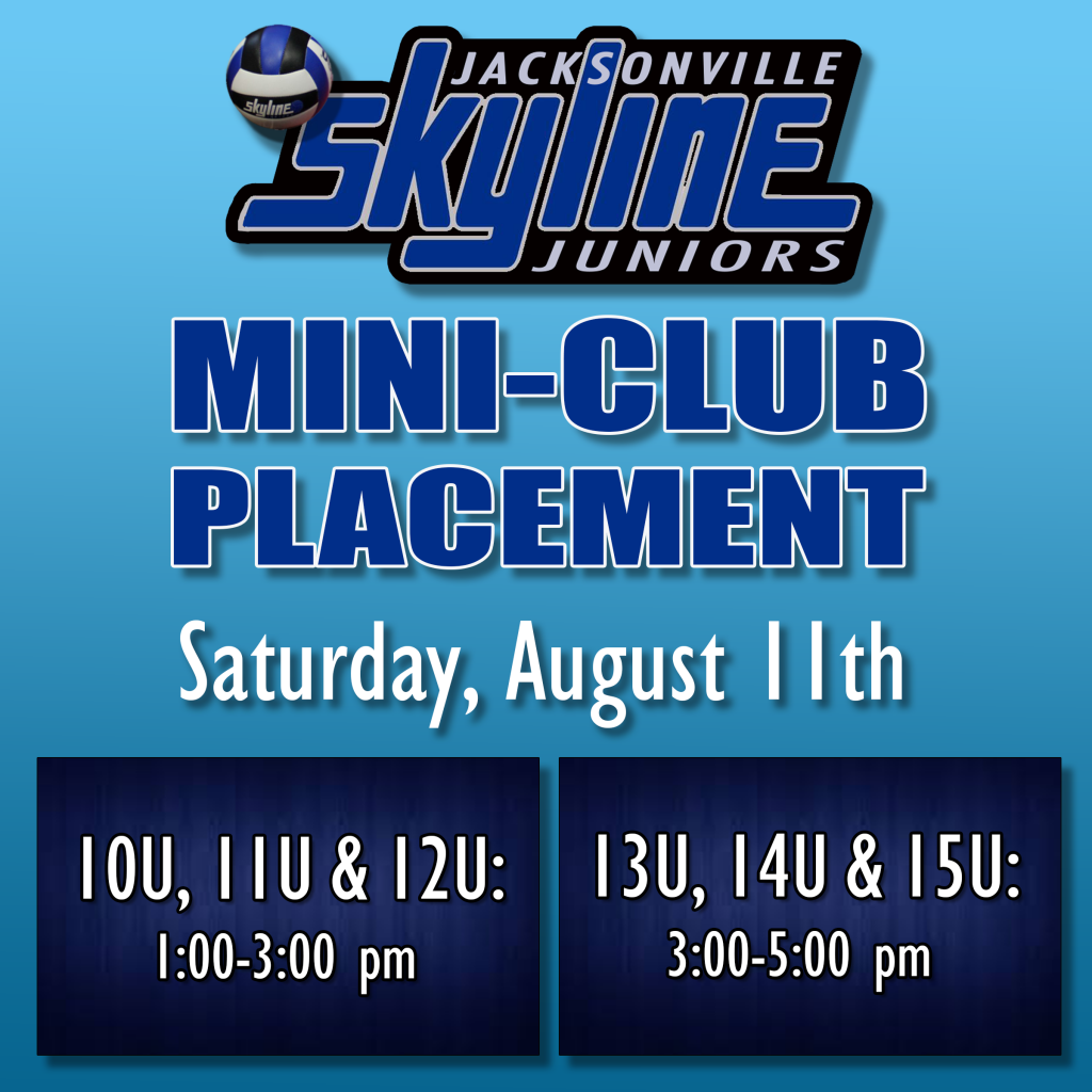 Placement is for all skill levels and is scheduled for Saturday, August 11th. Ages 12 and Under are from 1-3; and ages 13-15 are from 3-5. Be sure to register HERE!