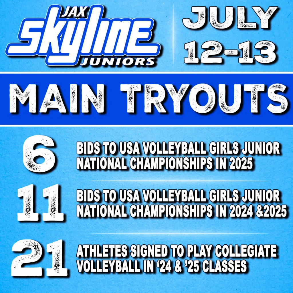 Tryout season is already here! Jacksonville Skyline is coming off another historic season, earning SIX bids to the USA Volleyball Girls Junior National Championships. This tops our program record of FIVE berths set in 2024. Both are records for number of GJNC bids for ANY club in history of the Jacksonville area!