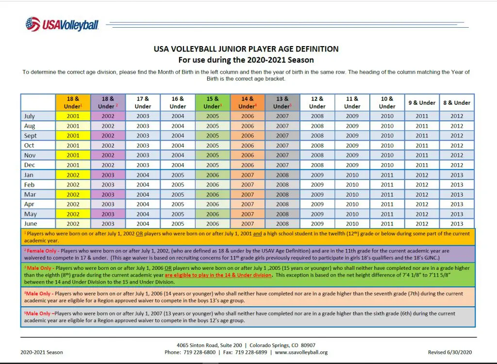 NEW FOR 2020-21: USA Volleyball and AAU Volleyball age definitions have changed from September 1 to July 1. While we prefer and believe it to be best for athletes to play within the age that places them in their corresponding grade, there are some exceptions- especially at the younger levels. See the Age Definition chart below. If you have any questions, please email us at info@JaxSkyline.com.
